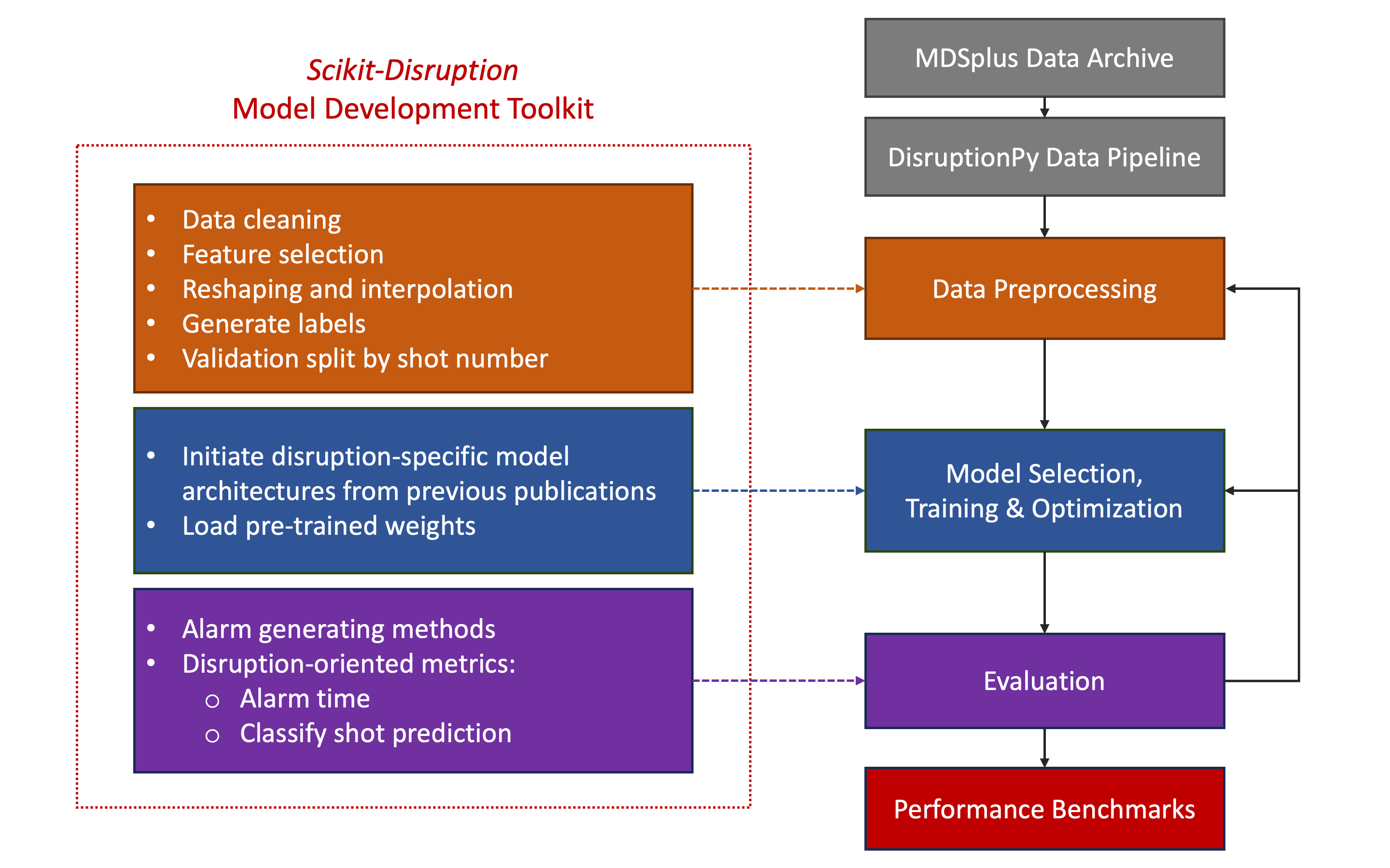 Consolidating previous research products into an open-sourced python library to facilitate rapid prototyping of disruption prediction models. This library, currently named “scikit-disruption,” will offer tools for preprocessing training data, initializing models, and computing performance metrics that are relevant to disruption prediction applications. It is designed to complement standard data science and machine learning libraries such as pandas, scikit-learn, and keras. It is also designed to primarily utilize the dataset produced by DisruptionPy, the multi-machine data retrieval and processing framework currently being developed by the PSFC Disruption Studies Group.